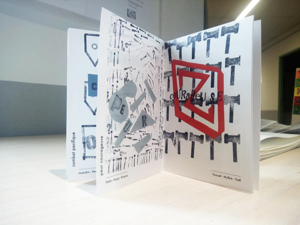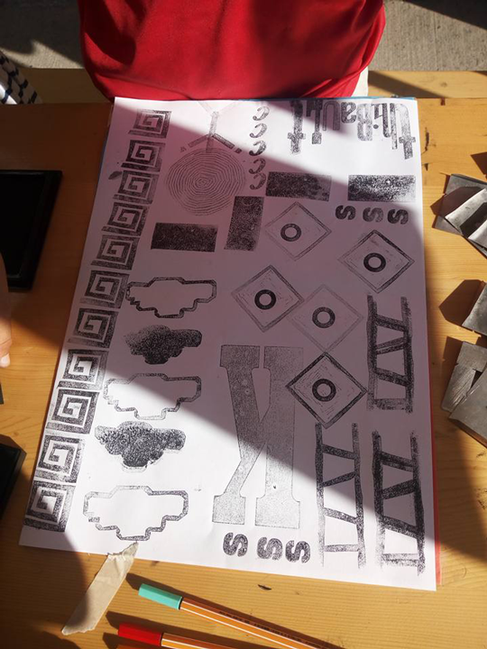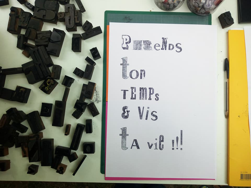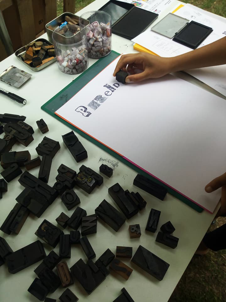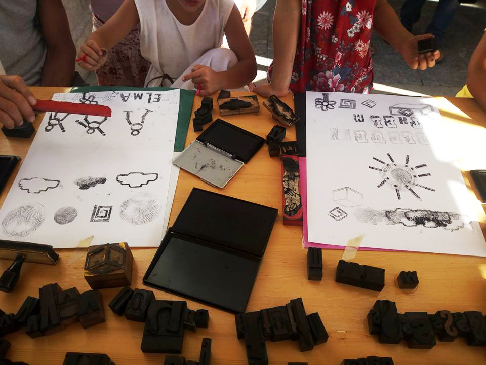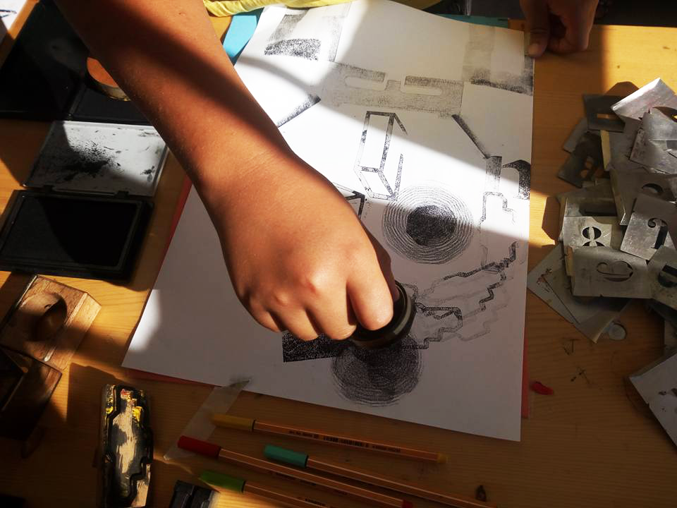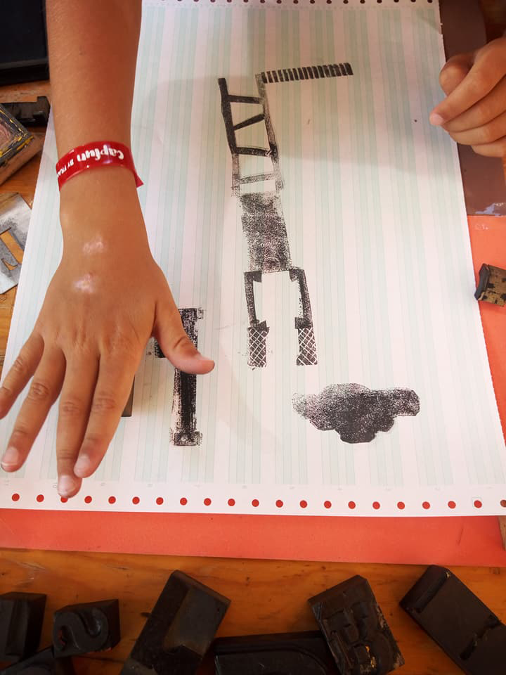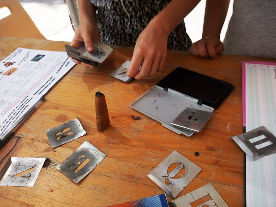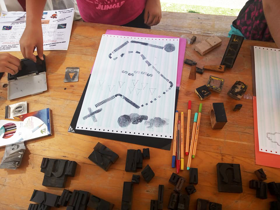 Permet d’initier l’expérimentation graphique sans complexe par : Le tamponnage à l’aide de caractères bois d’imprimerie ou de tampons réalisés par mes soins, des pochoirs, des caractères transferts, des papiers, feutres et autres crayons, une machine à écrire… Jusqu’à, parfois, l’utilisation de pâte à modeler, de briques de construction, de gommettes… Toutes techniques qui puissent engendrer l’acte créatif libre.