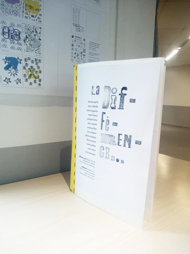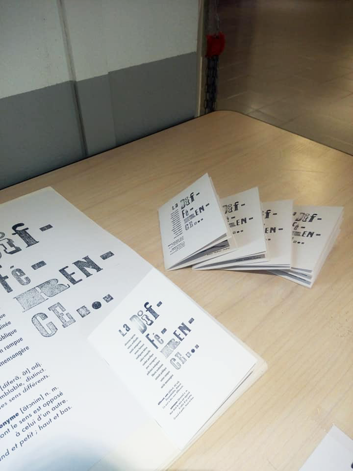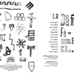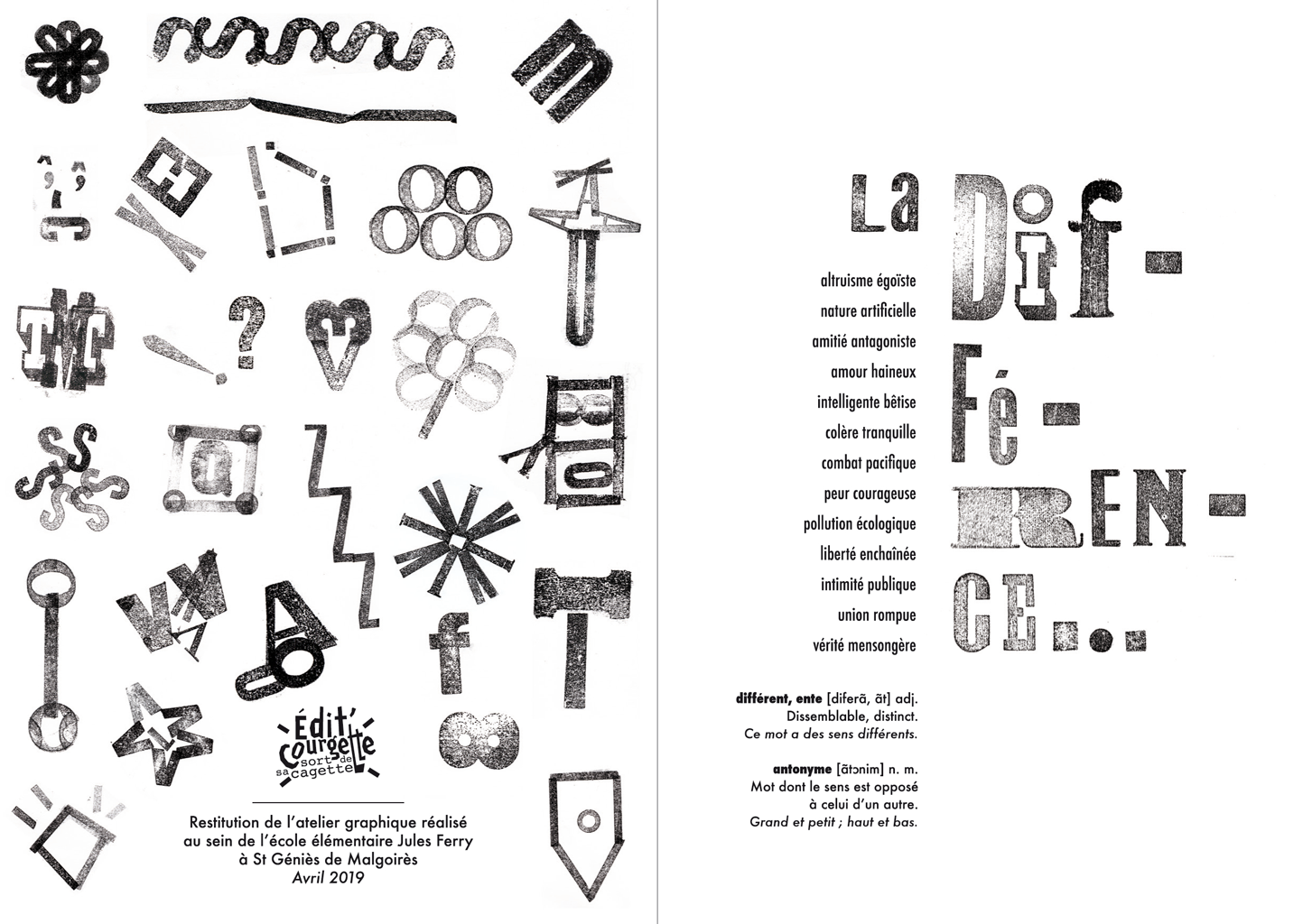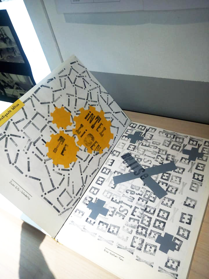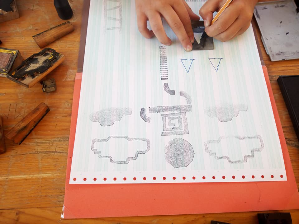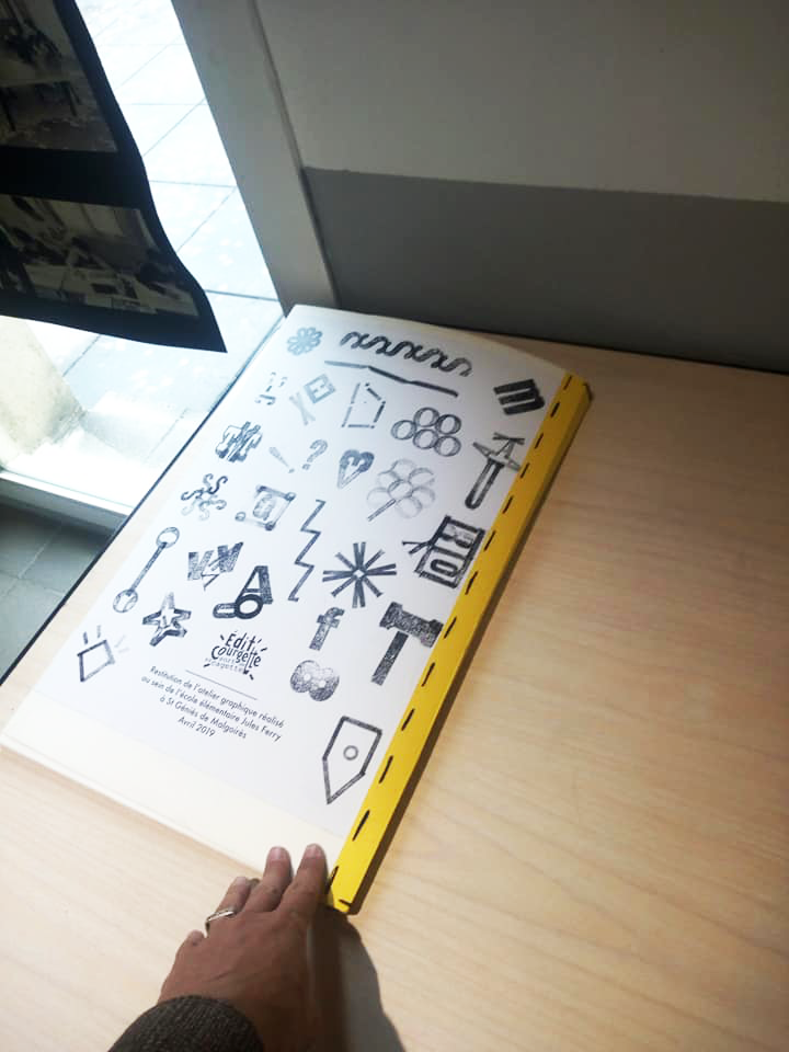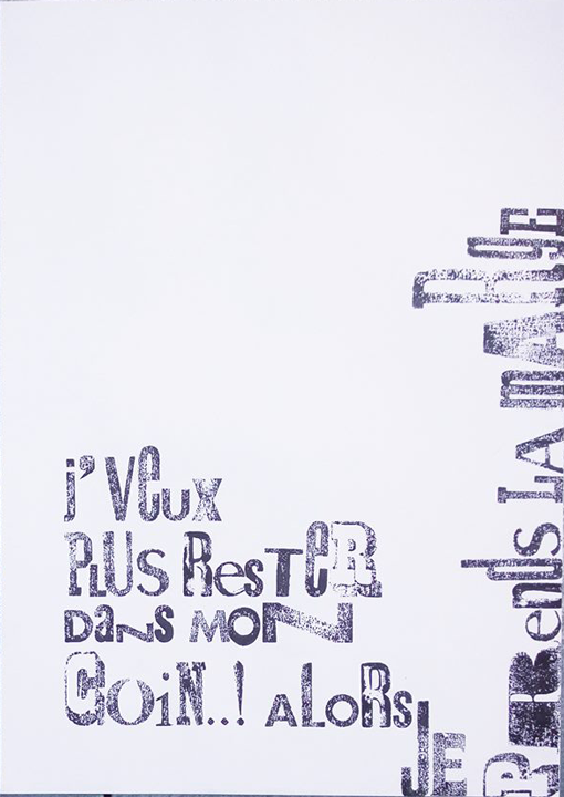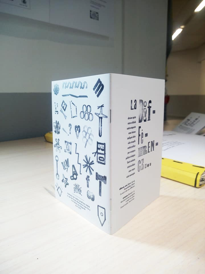 Permet d’initier l’expérimentation graphique sans complexe par : Le tamponnage à l’aide de caractères bois d’imprimerie ou de tampons réalisés par mes soins, des pochoirs, des caractères transferts, des papiers, feutres et autres crayons, une machine à écrire… Jusqu’à, parfois, l’utilisation de pâte à modeler, de briques de construction, de gommettes… Toutes techniques qui puissent engendrer l’acte créatif libre.