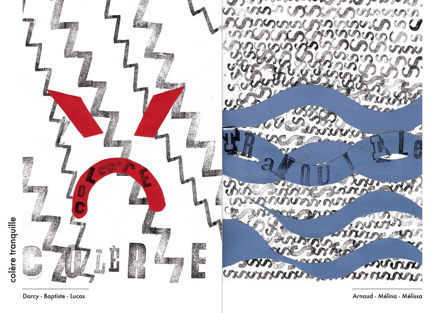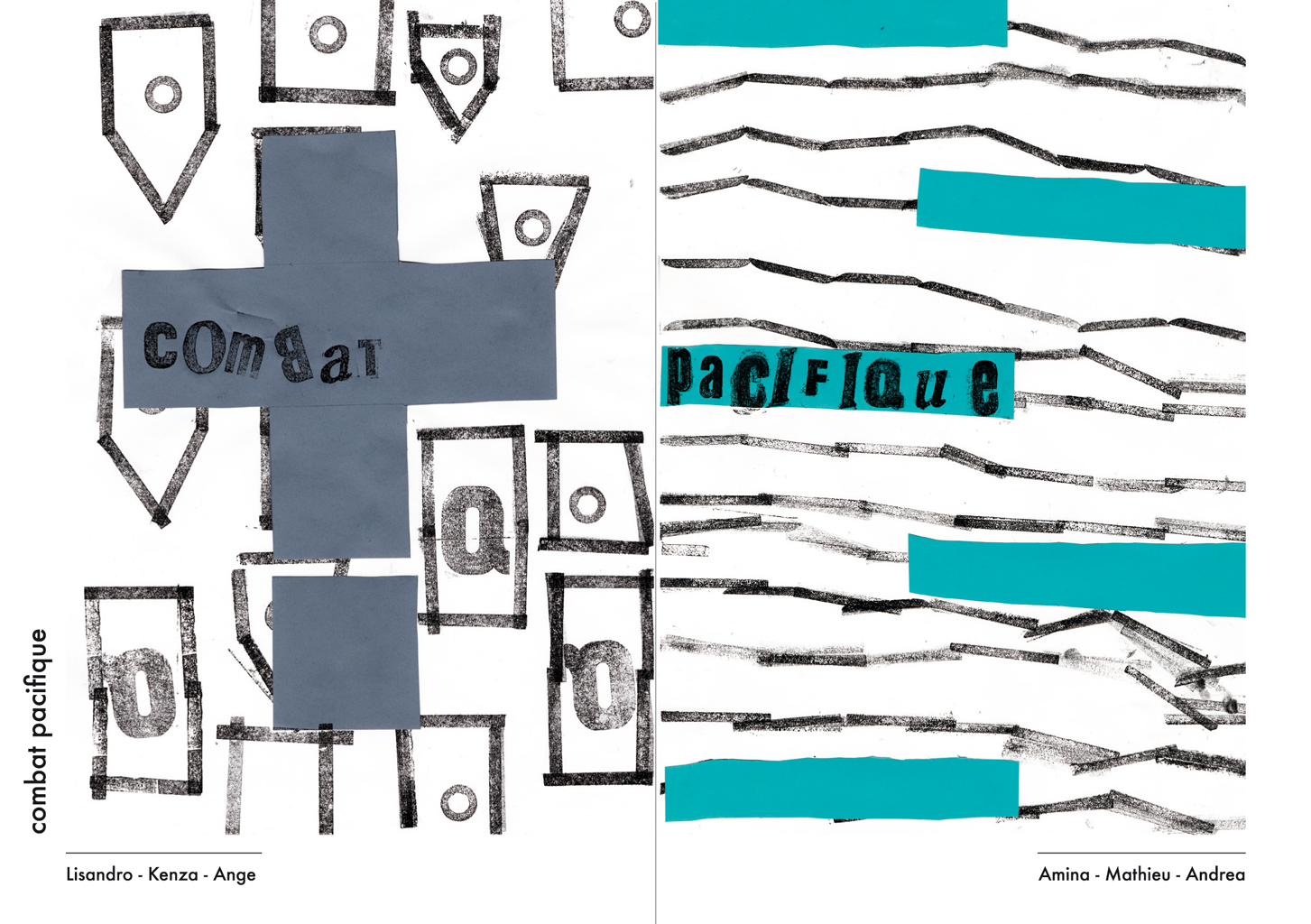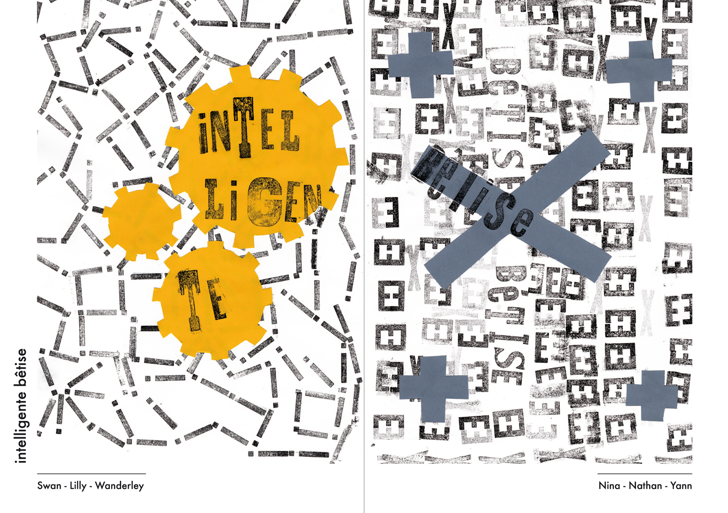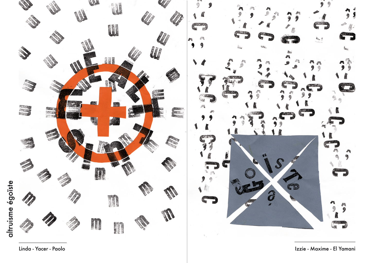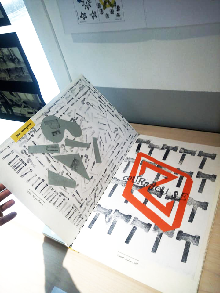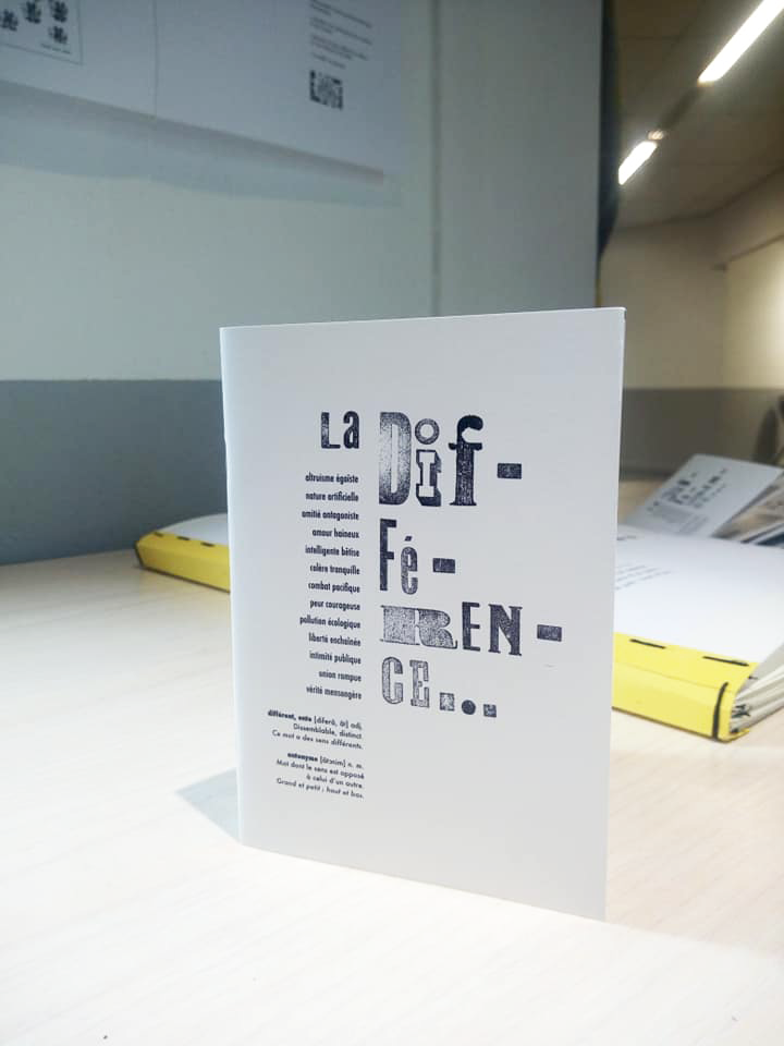Permet d’initier l’expérimentation graphique sans complexe par : Le tamponnage à l’aide de caractères bois d’imprimerie ou de tampons réalisés par mes soins, des pochoirs, des caractères transferts, des papiers, feutres et autres crayons, une machine à écrire… Jusqu’à, parfois, l’utilisation de pâte à modeler, de briques de construction, de gommettes… Toutes techniques qui puissent engendrer l’acte créatif libre.