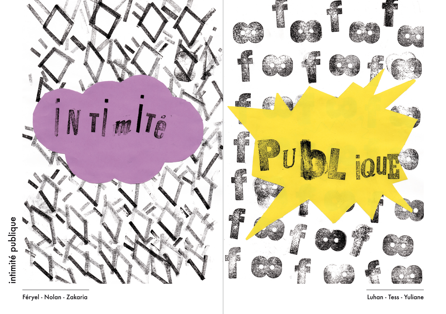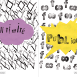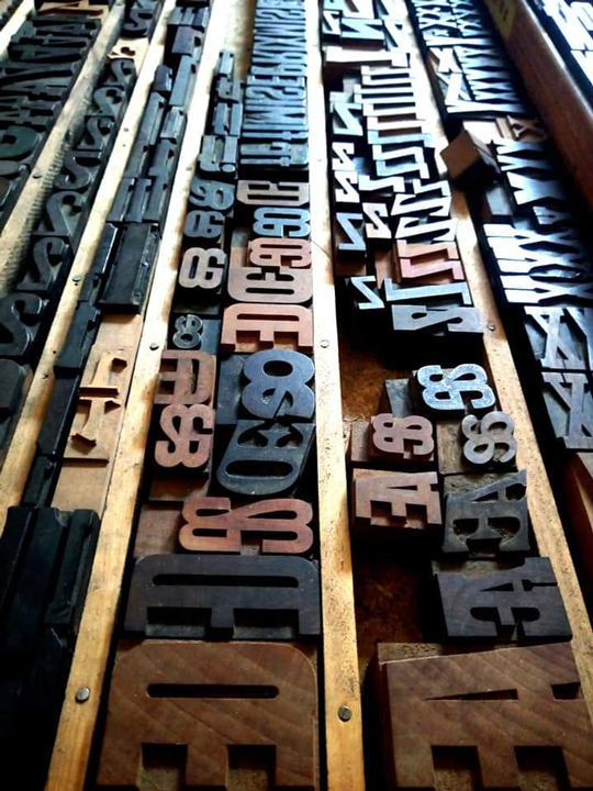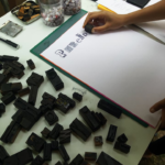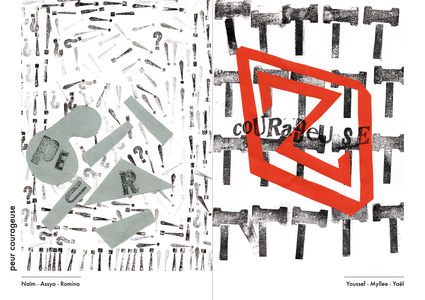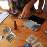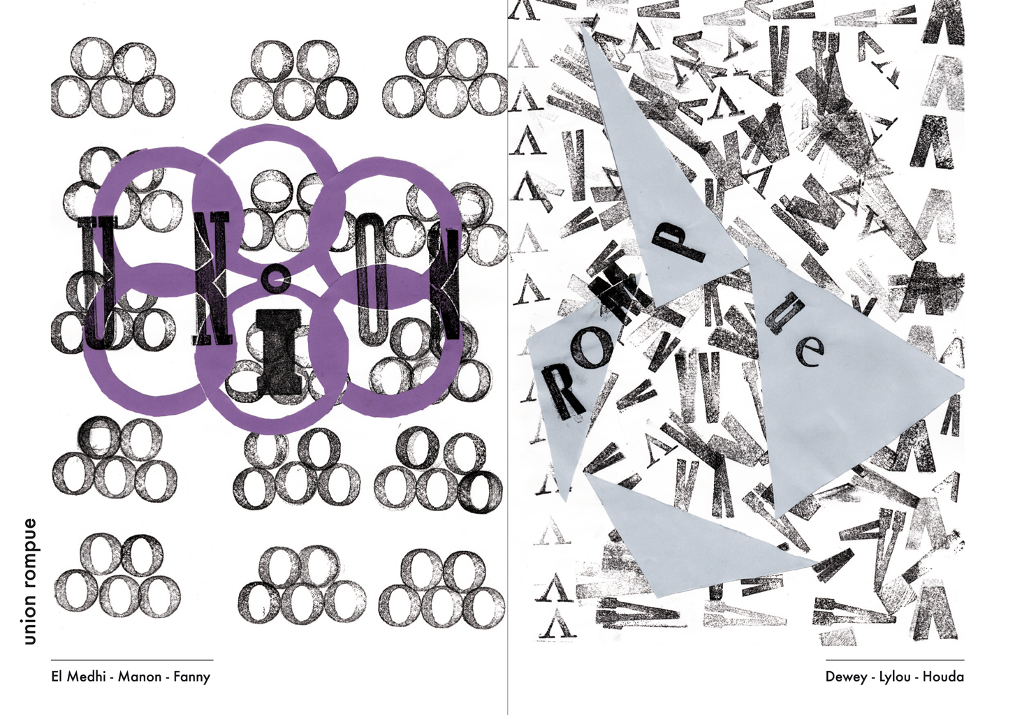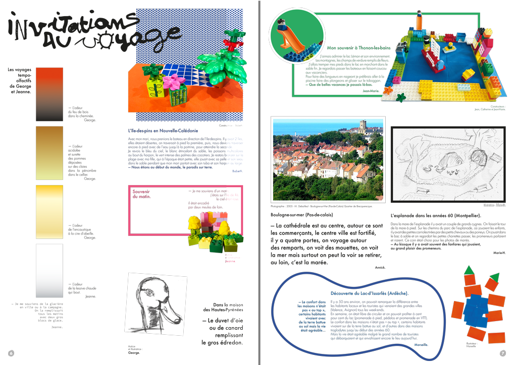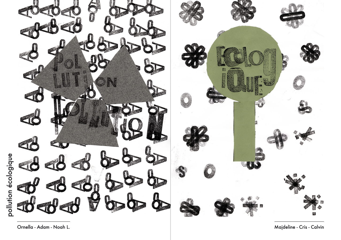 Permet d’initier l’expérimentation graphique sans complexe par : Le tamponnage à l’aide de caractères bois d’imprimerie ou de tampons réalisés par mes soins, des pochoirs, des caractères transferts, des papiers, feutres et autres crayons, une machine à écrire… Jusqu’à, parfois, l’utilisation de pâte à modeler, de briques de construction, de gommettes… Toutes techniques qui puissent engendrer l’acte créatif libre.